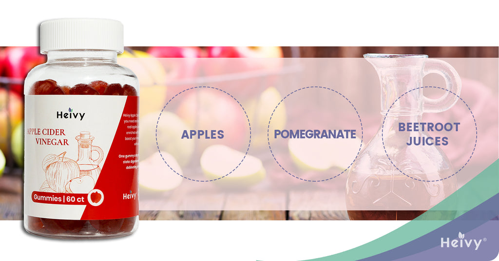 Apple cider vinegar is made from apples — cores, peels, flesh, and all. To turn apples into vinegar, they need to be combined with yeast, which starts the fermentation process. As the active ingredient found in all types of vinegar, acetic acid gives vinegar its signature sour taste and smell. Studies suggest acetic acid is one of the reasons why apple cider vinegar is said to have so many natural health benefits. For ACV in particular, the recognizable aroma of real fruits stands out as a welcomed flavor for Heivy's ACV gummies, which has more fruits than its name suggests: pomegranate and beetroot juices are key add-ons that contributes to the rich flavor than just apples.