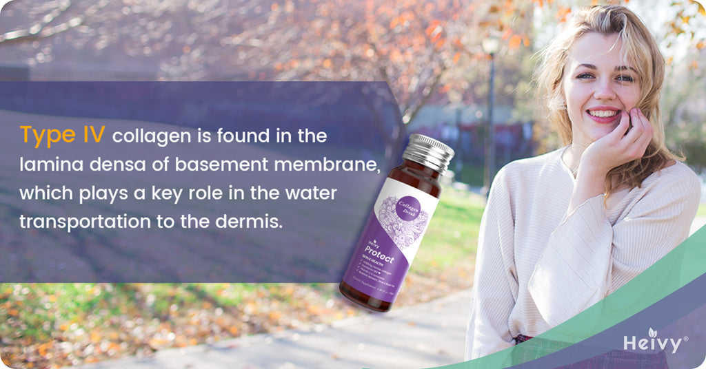 Type IV collagen is found in the lamina densa of basement membrane, which plays a key role in the water transportation to the dermis. The basement membrane is a layer at the bottom of the epidermis, where the epithelial cells sit. It is a strengthful membrane between the epidermis and the dermis. The 50-90-nanometer-thick membrane carries over nutrients, discharges wastes, and communicates among cells. It also maintains the basic structures of the epidermis as well as the dermis in order to maintain the functionality of skin: to "breathe" for oxygen and to protect our body from external damages like abrasions or sunburn.